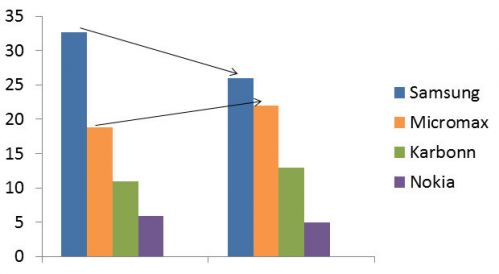并且,这不是没有征兆的,只有当 Micromax 取代三星成为市场第一这样“量变产生质变”的结果出现时,人们才会意识到,(印度/中国)国产手机居然如此强势。早在 2013 年的时候,Micromax 就在不断拉近与三星的距离,并且在印度前几的智能手机品牌中,印度本土的 Micromax、Karbonn、Lava 和国际品牌形成分庭抗礼之势: