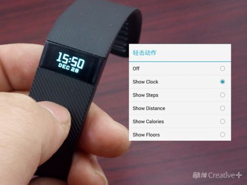 ↑Charge除了能通过侧面的按键实现点亮屏幕外,还能通过两次轻击手环表面实现快捷亮屏,不过这种方式只能查看固定内容,比如设置的是“时间显示”,那么双击亮屏就只能查看时间,不能像侧键一样按一下切换一个内容。在手机端APP上可以更改单项内容,不过大家都看到了,这个部分的中文优化还不完整,只能显示英文。