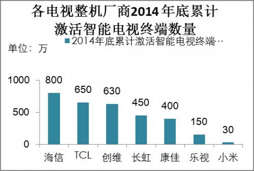 日前,综合了中信证券、中国经营报、中怡康等多家机构的调查数据显示:截止2014年年底,中国主流电视厂商创造了总量为3110万的智能电视用户总量。其中,海信以800万位居榜首,TCL、创维分列2、3位。号称“颠覆者”的乐视用户数量只有150万;靠互联网思维红遍智能手机市场的小米,智能电视用户数量只有30万。