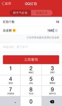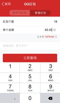 第一种,拼手气红包:设定红包个数和要发的金额,写上祝福语,点击“立即塞钱”并输入支付密码,选择要发放群或讨论组即可。金额随机发放给小伙伴们,拼人品的时候到了!
